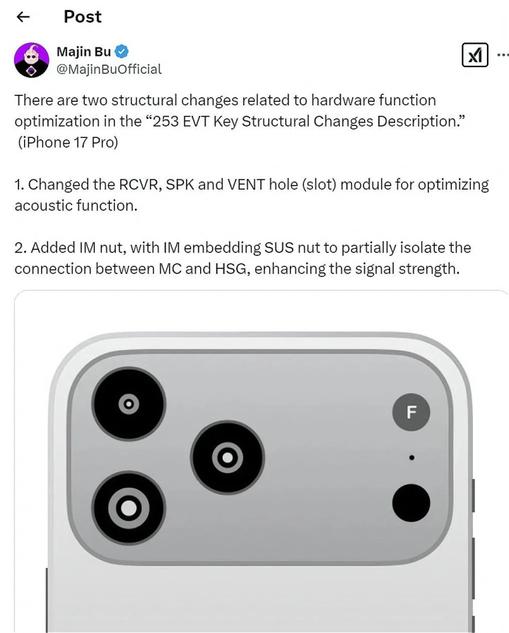 好消息是近期有爆料称iPhone 17 Pro系列会引入一项重大结构调整,那就重新设计天线架构,这其实就属于射频设计的内容,通过改变天线位置与布局,提升信号接收稳定性。